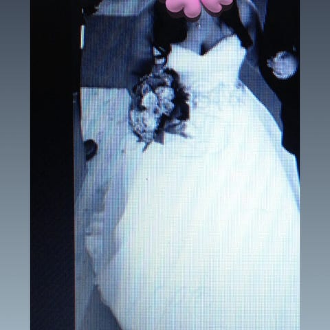 Hvit kjole på bredere stropper av satin avsluttet med tyll og blonder.Blonder med lange ermer, hvite satengsko størrelse 35, hvit satengpose.