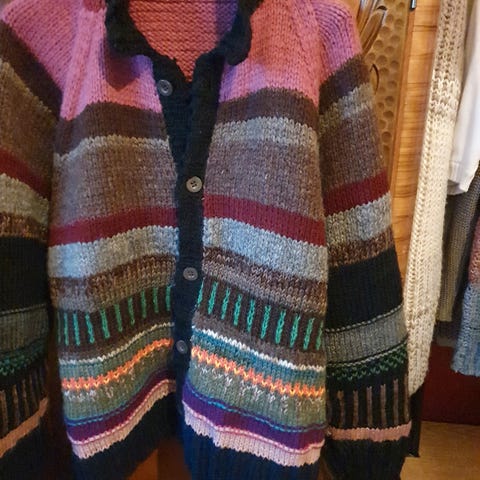 Håndlaget strikket cardigan, veldig langt 110 cm, overvidden ca 120 cm. Armlengde uner armhulen 41 cm. Strikket i Trysil lett koblet garn, blanding av ull og akryl.