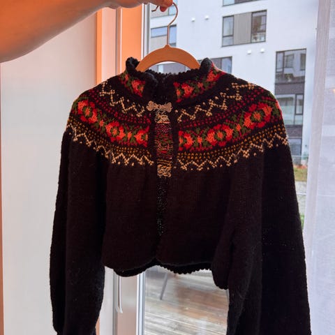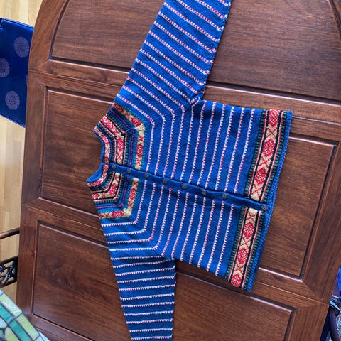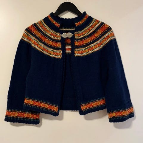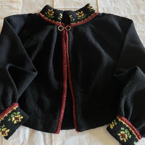 Hjemmestrikket jakke til vestfoldsbunad størrelse M selges. Helt ny.