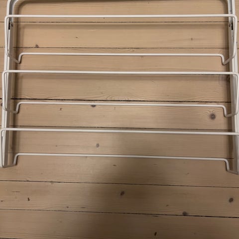 Selger 3 stk Elfa skostativ som festes til vertikale skinner. Passer til Elfa-system med bredde 60cm. Selges samlet for 250kr totalt.