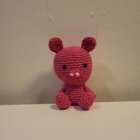 Bamse heklet i slitesterkt garn, slik at den tåler både lek og vask. Safety eyes er festet på innsiden. Passer perfekt i gave ☺️
