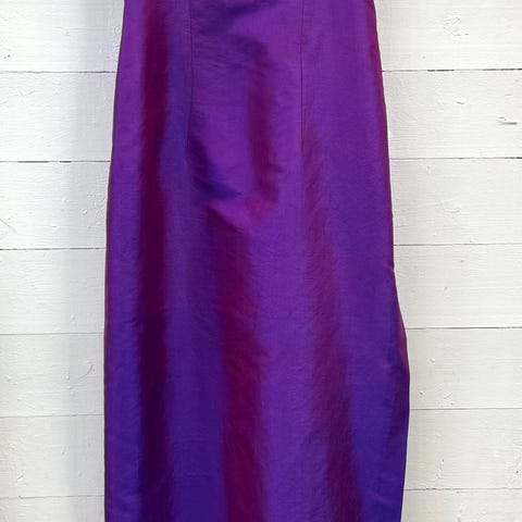 Nydelig vintage silkekjole fra merket Hello, laget i Kina. Kjolen er i 100 % silke med et elegant, ton-i-ton rosemønster i en vakker dyp kongeblå farge. Den har en feminin fasong med innsving i midjen (36 cm) og knepping foran. Lengde: 90 cm. Ermene går til under albuen, og kjolen passer perfekt til både spesielle anledninger og som statement-plagg i hverdagen.