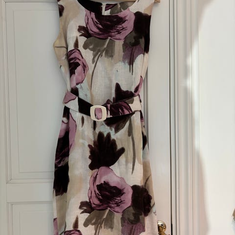 Sommerkjole i nydelige farger, i bl annet oransje, gult, grønt og litt rosa, svært lite brukt og fremstår som veldig pen. Kjole er helfôret, både kjolen og fôret Dr i 100% bomull.