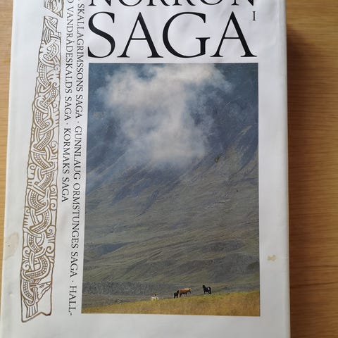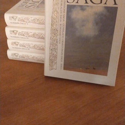 Norrøn saga komplett i fem bind. Flott innbundet med topp gullsnitt og pen dekor. Pent illustrert med tegninger. Kan sende.