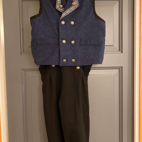 Foret på innsiden av vesten er slitt pga at borrelåsene hekter seg i foret, det mangler også en pynteknapp på buksen (se bilde).