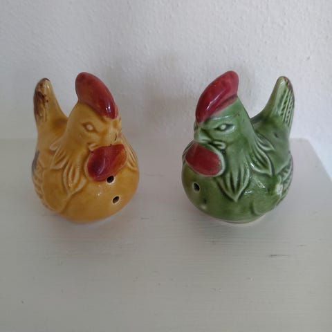 Salt og pepper kar utformet som fugler i sølvplett selges sammen med eldre fat fra 1929 , samlet kr 100.