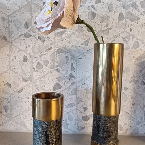 To vintage telysestaker fra Saulo. I god stand med forventet bruksslitasje. På den lille er det en liten glipe mellom basen og den nederste messingringen (se bilde). 12x5 og 9x5 cm.