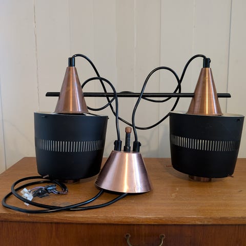Vintage triple Taklampe Teak og messi