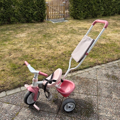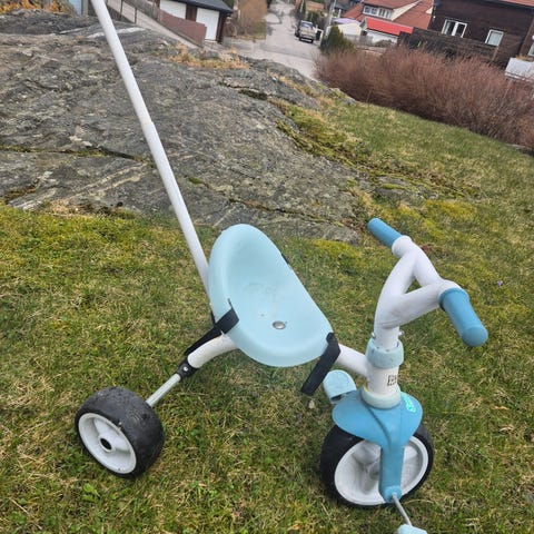 Pent brukt trehjulsykkel med avtagbar solskjerm. Den ene hjullåsen bak er ødelagt, men det har ikke noe å si for bruken. Den er delvis sammenleggbar, og lett å få med seg. Må hentes.