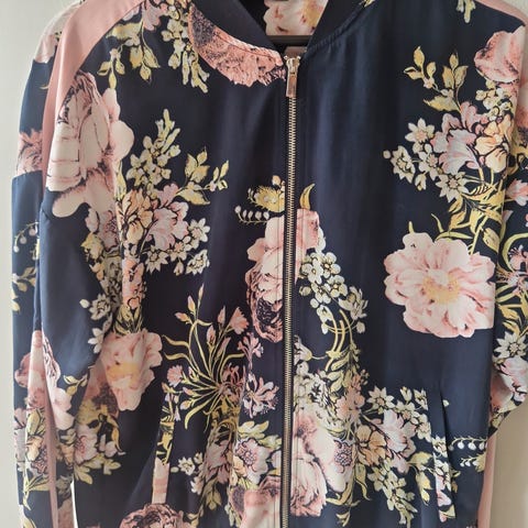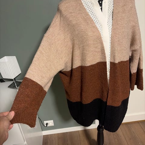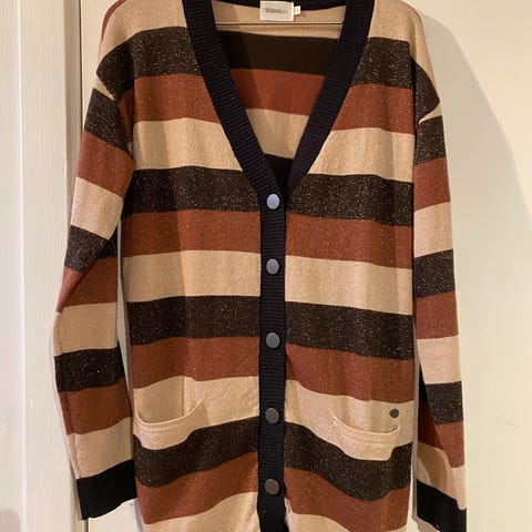 Dranella cardigan i grå/oransje og hvit. Jakken er lite brukt, men har noe litt nupper som enkelt fikses med en nuppefjerner.