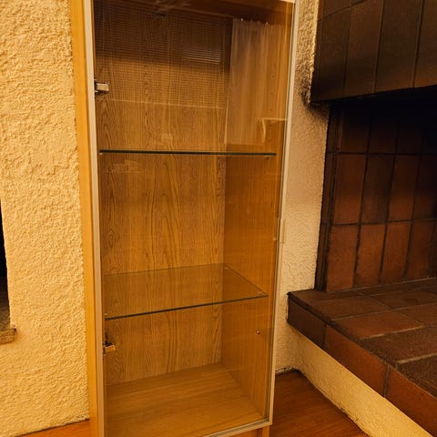 3 glasshyller og glass dør