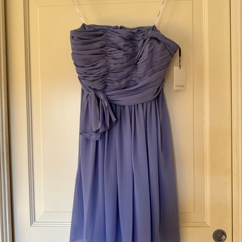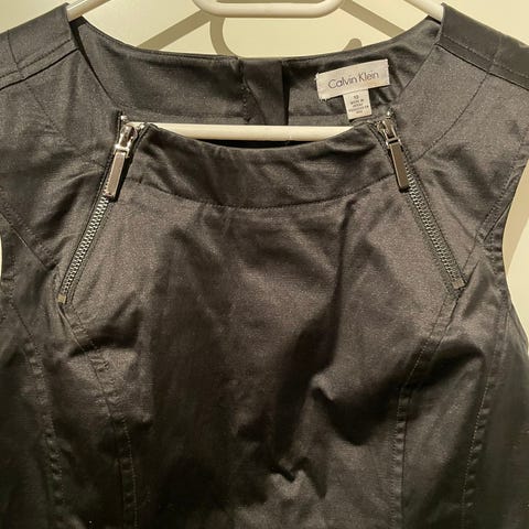 Nydelig kjole fra Calvin Klein av mykt stoff med komfortabel strech. Flatterende passform med drapering over frontpartiet og med faux omslagssnitt. Med diskré glidelåslukking i rygg, og elastikk i livet. I meget god stand.