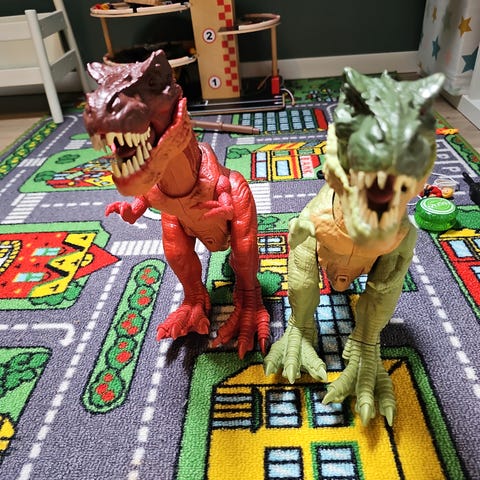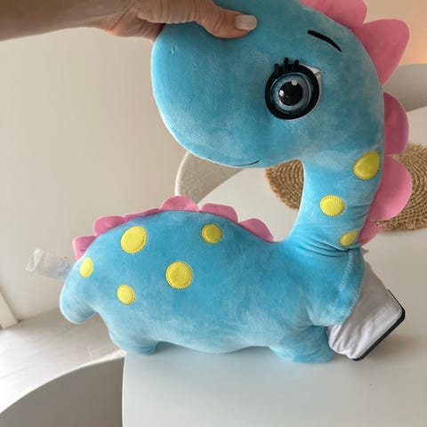 Stor dinosaur bamse til å klatre/sitte på. Står veldig stødig. Øynene er tatt ut (løse knapper) pga små bar ikke skal svelge dem. (Følger ikke med) Men en kan nok sy inn på nye om man ønsker.