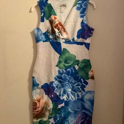 Nydelig sommerkjole uten ermer. Merket heter Allison. Str. 42/16. Mønster med blomster og sommerfugler. Tynn og lett, uten for. Glidelås i ryggen. Noen små, brune detaljer kan se ut som flekker, men er en del av mønsteret.