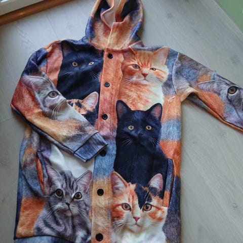 Kjempe tøff hjemmesydd genser selges. Kun brukt 1 gang. Kult motiv fra Primastoff i myk og god Jersey. Blå ribb fra Stofflykke.