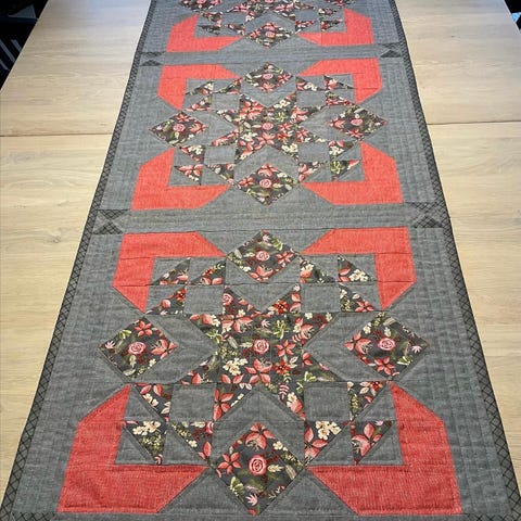 Jeg har brukt 100% god kvalitet bomull, sydd sammen bitene på maskin og deretter har jeg håndquiltet hele løperen. OBS!! Har satt ned prisen fra kr. 1200,- til kr. 900,-