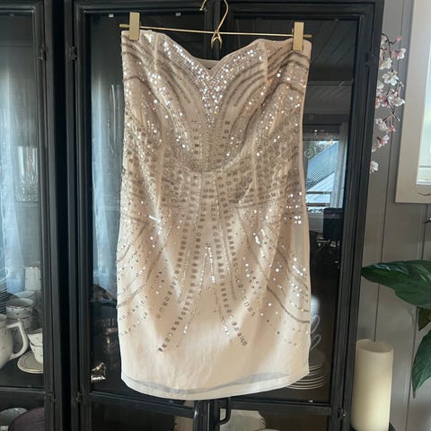 Lite og pent brukt kjole fra Joseph Ribkoff. Kjolen er ermløs og kan brukes både som sommerkjole og i selskaper. Bunnfargen er hvit med sort mønster. Den er foret. V-ringning, dekorativt bånd under bysten. 95% polyester, 5% spandex/elastan. Laget i Canada.