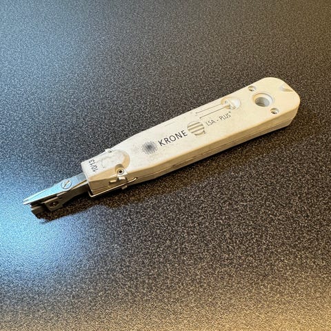 Selger et brukt, men fullt fungerende KRONE LSA-PLUS punsjverktøy for tele-/nettverkskabler. Dette er et profesjonelt verktøy for terminering av kabler i LSA-plinter, typisk brukt i tele- og nettverksinstallasjoner.
