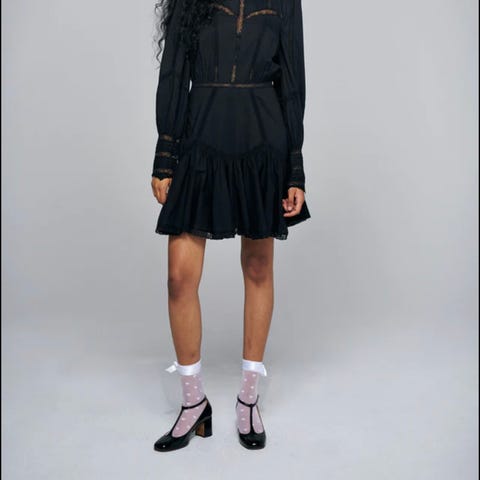 Midikjole med omslag og krage, v-hals, dekorativ lomme, albuelange ermer med mansjetter med knapper og en rynket elastisk midje med omslagslukking og diamantformede sølvknapper.