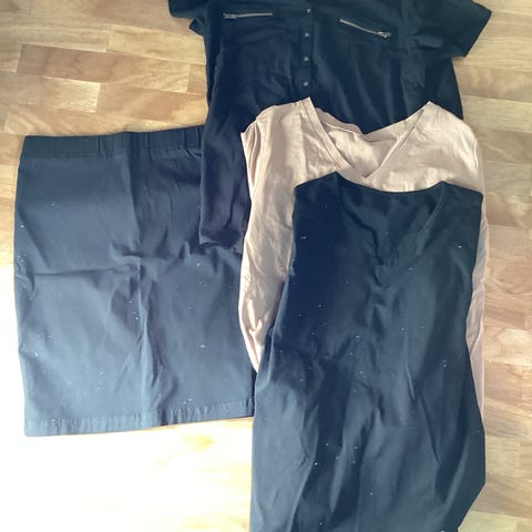 Til voksen dame.Pent praktisk 2 delt drakt. Skjørt og bluse. Som også fint kan benyttes hver for seg. Flatterende løs fasong. Sort med lyst mønster. Modellen er for tynn og ung til antrekket