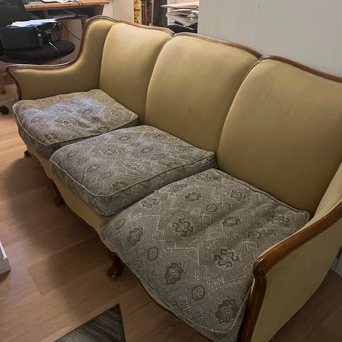 Mål sofa, BxLxH = 80x225x78 cm. Sofaen er lite slitt. Seteputer kan benyttes på begge sider.