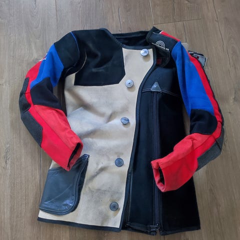 Links skytterjakke i Saueskinn str. 52. Kjøpt hos Willy Røgeberg i Oslo 1978.