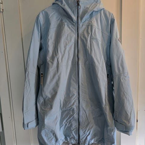 Jakken er beige med lyselilla detaljer. Det er også en avtagbar innerjakke som gjør jakken litt varmere enn «kun» en skalljakke.