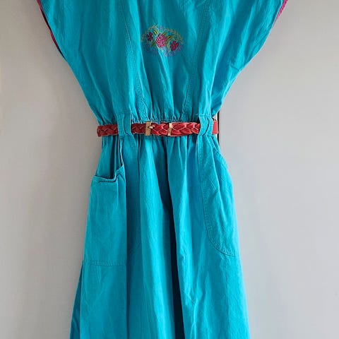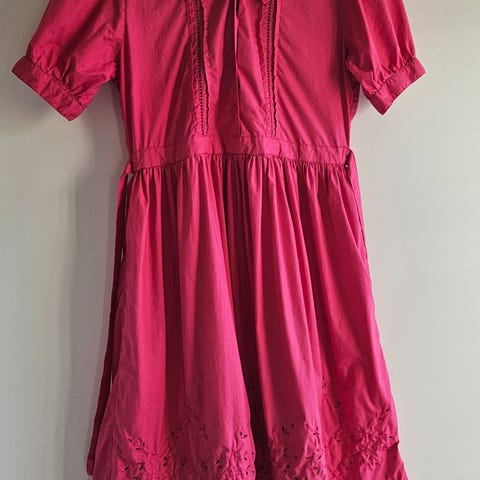 Blomstret vintage barnekjole med sløyfe på sidene. Kjøpt i Frankrike på 80-tallet. Str. 152, ca. 11-12 år. 50% bomull, 50% modal.