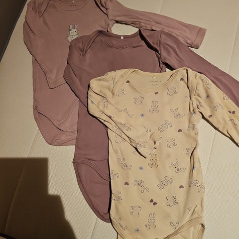 Selger en pakke med 3 fine bodyer. De er pent brukt, men bruksmerker kan forekomme. Den hvite har noen prikker på baksiden (se siste bilde). To fra name it og en fra H&M. Den ene er str 74 og de andre i 80, men har brukt de samtidig.