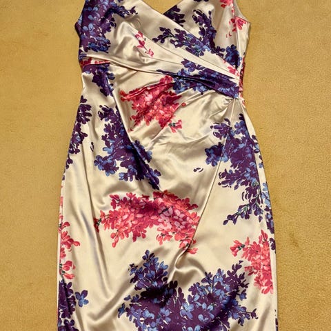 Lekker fargerik selskapskjole , sateng , str 42