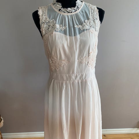Blondekrage og blonde detaljer, strikk i liv og ermer.