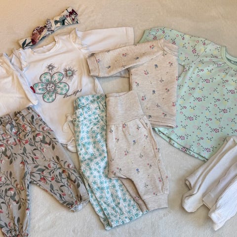Stor klespakke i str 50/56 selges. Masse fine plagg - noen er mer, mens andre er knapt brukte. Uten hull eller skade. Litt slitasje eller misfarging kan forekomme - se eget bilde.