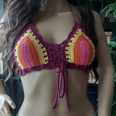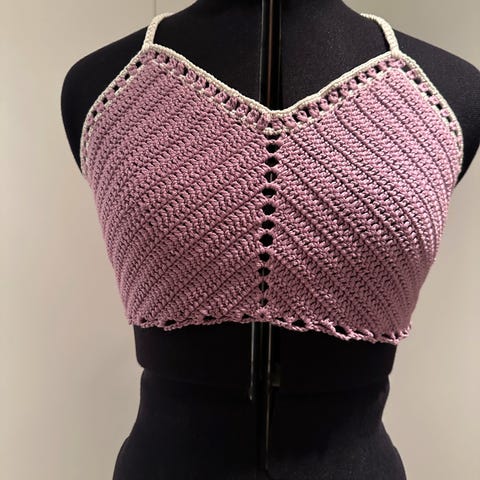 Lekker crochet bikinitopp i heklemønster i en fin beigefarge. Toppen er kun brukt en gang, og er størrelse L. Materiale: 90% polyester, 10% elastan. Jeg sender stort sett alltid første virkedag etter mottatt penger for frakt :)