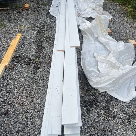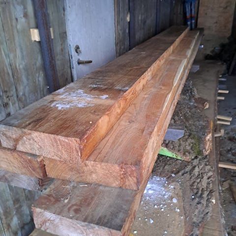 ujustert plank av gråor, 1" 4", og 1" 6". (2,5/10 cm og 2,5/15 cm) i alt ca 200 lm. materialene er i ca 3 meters lengder, hvorav 6 stk 6 toms bord på 4 meter.