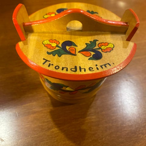 Et kjempefint trebeger til å putte rømmeboksen oppi på festbordet det er fra 2001 og er håndmalt, det står en personlig tekst under begeret som avslører dette. Mønsteret som er håndmalt på er teksten rømme på begge sider og nydelige blomster i gult grønt rødt og sort Perfekt til 17. mai!