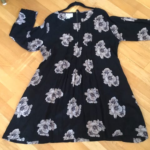 Kjolen ble brukt en gang. Er i 80 % viskose og 20 % lin. Str. L og i farge beige med sorte stikninger. 60 cm over byste og 112 cm lengde. Ermene er 35 cm lange m/ stikninger. Elegant, lekker kjole. Gratis frakt, sendes i posten.