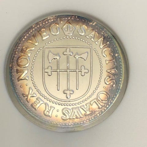 Sølvmynt i plast fra Kongsberg mynt 1997. 8,8 gram 0.925 sølv. Kopi av Olav Engelbrektssons mark uten år. Litt anløpt i kanten revers. Se bilder. Kan sendes