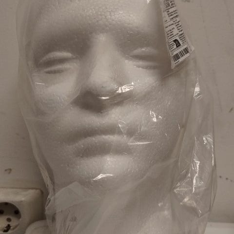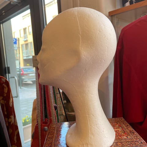 Gjennomsiktig uni-sex glasshoder - ideele for visning av hatter, parykker og briller. De er laget av 100% gjenbruksglass og tåler derfor ikke oppvaskmaskin. Mål: Ø 58 x H 30 cm.