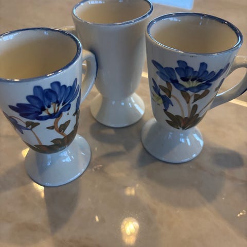 Hvit kopp med fint rosemønster. Høyde 12 cm. Bredde 13 cm. 8 dl når koppen er helt full opp til kanten. Den er hel og fin, men noen merker sølvfarget inni - trolig fra røring med skje eller oppvask. Pent og litt synlig brukt. Hvis den skal sendes må det nok være i mellomstor pakke - må pakkes godt for å ikke knuse. Se bilder.