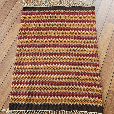 Tekstilkunst, vevd åkle/ løper i jordfarger av tynn ulltråd.