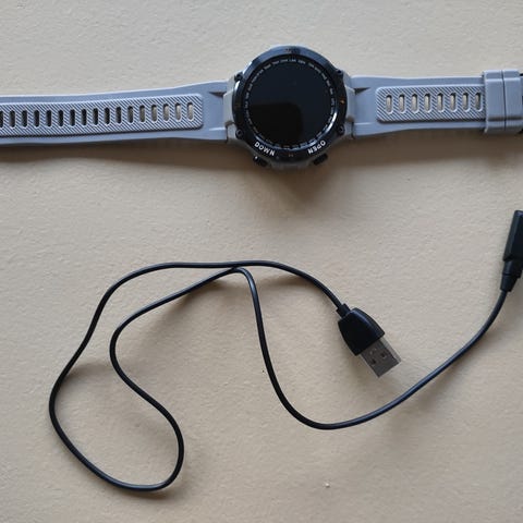 Fungerer utmerket. Er litt riper i skjermen etter bruk. Ingenting plagsomt. Har ikke ladekabel. Mangler den hempen man stikker klokkereimen inn i.