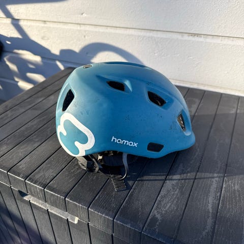 Gir bort en godt brukt, men ikke skadet, sykkelhjelm for barn. Jeg er usikker på størrelsen, men den veier 231gram og mangler et par av de tynne putene inni, så heller mot at det er den største størrelsen på 52-57cm. Den har vært brukt til en gutt fra ca alder 1,5 år til 3+.