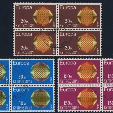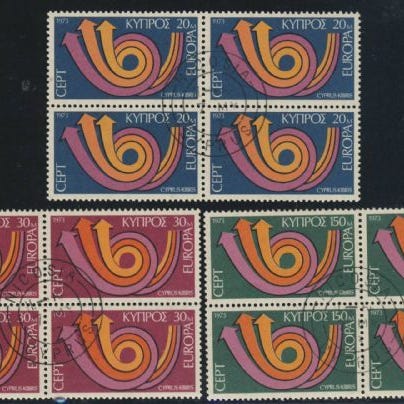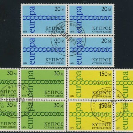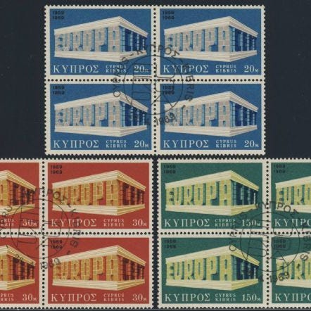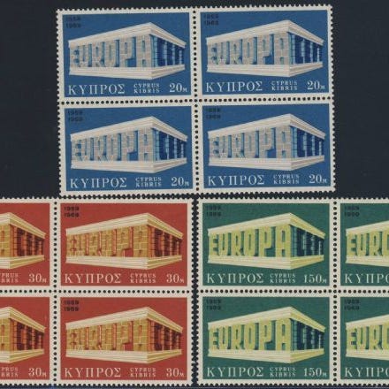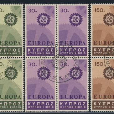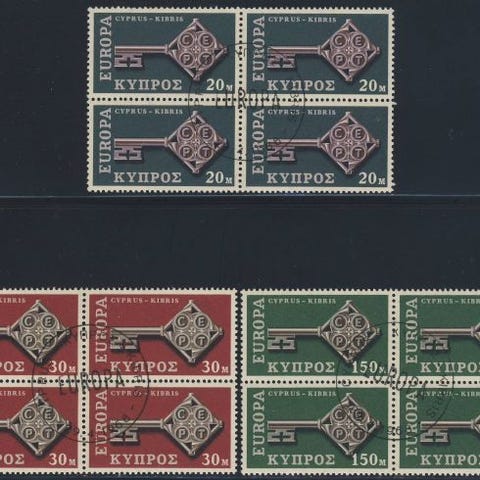 90% rabatt: Cypros 1963 Europa Cept. Michelnummer 225-27 i 4-blokker (Stemplet).