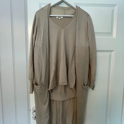 Tøff og stilig sett - bukse og jakke i ullblanding fra Tante Maggy, str M (passer til S-M). Materialet er 40% ull/30% bomull/30% viscoze. Kan brukes sammen eller hver for seg. Pent brukt.