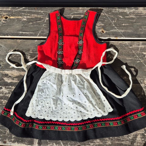 Hel lengde 51 cm. Tror jeg brukte den fra 1,5 år og oppover. Kan sys opp på skuldre.