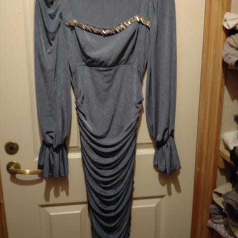 Nydelig kjole i blå/grå farge med gull til festlige anledninger