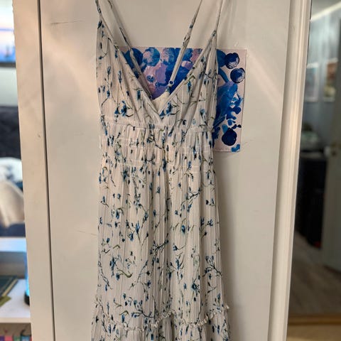 Fargen er sommerfrisk og feminin, med delikate detaljer som gir et avslappet, men stilfullt uttrykk.