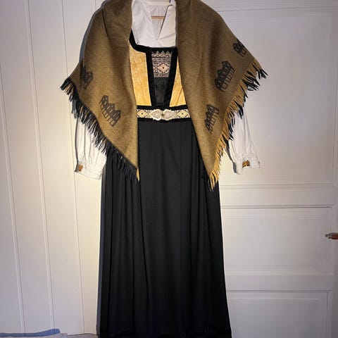 Jeg selger to Vestfoldstakker, vikinginspirert. Designet og sydd av Gro Kjøll. Den ene er i mosegrønnt ullstoff, den andre med linskjørt. Den grønne med silkeskjorte den andre med okerfarget bomullsstoff, tre kvart lang erm. Disse kjøpte jeg i fjor men ikke brukt av meg. Vet ikke hvor gamle de er. Mye tilbehør er med og avbildet. Mye sølv i Oseberg. Skinnbelte og veske. Silkeskjerf fra Tyrihans ikke brukt.
