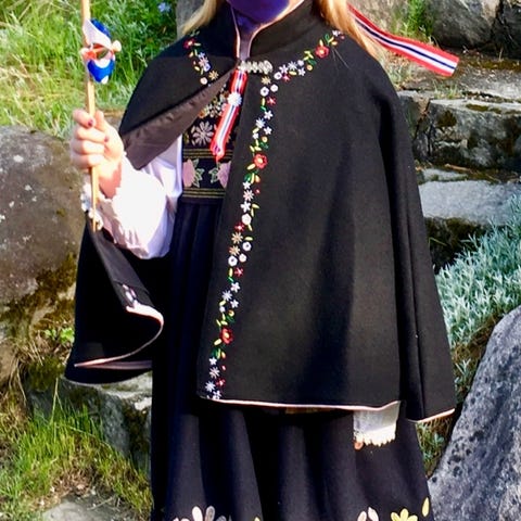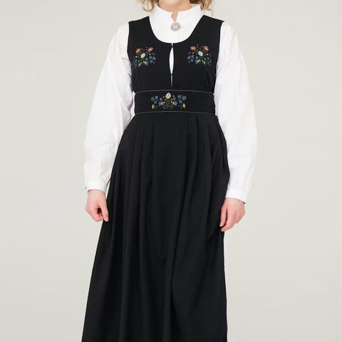 Komplett drakt med stakk, belte, skjorte og tørkle.