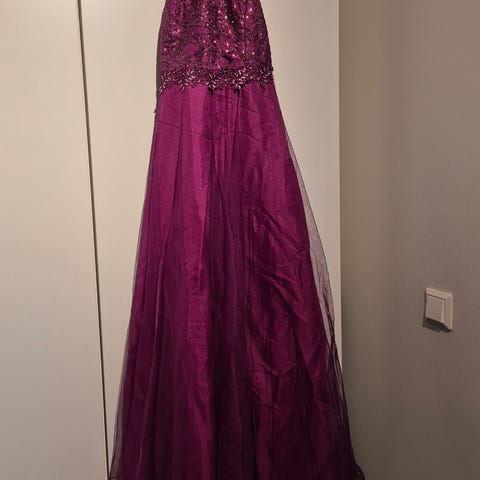 Pent brukt lilla kjole. Brukt til 7 klasse avslutning og en komfrimasjon. Hel og pen bortsett fra den lille sømmen som har gått opp i innenfor. Dette synes ikke. Usikker på str men brukt av en jente på 13 år.